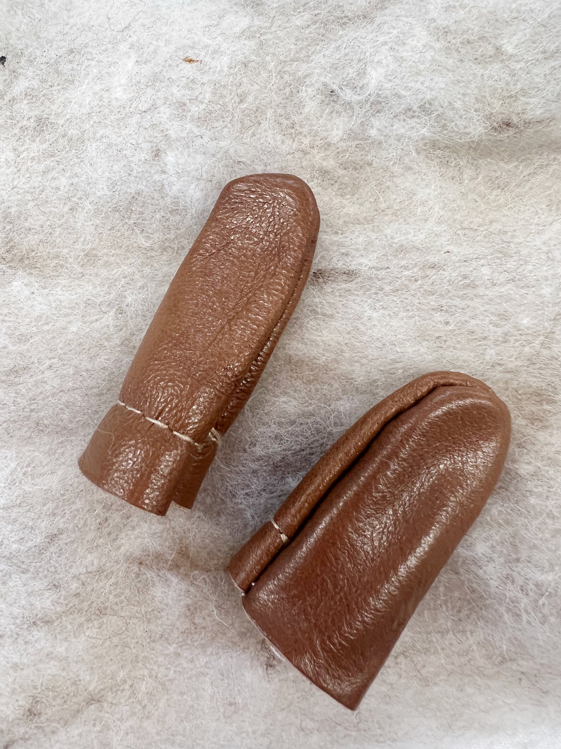 Poke yourself once too many times? These leather finger protectors help save your fingers from accidental pokes! The finger protectors are mean to cover your index finger and thumb. There is one of each in the pack. *color of leather may vary